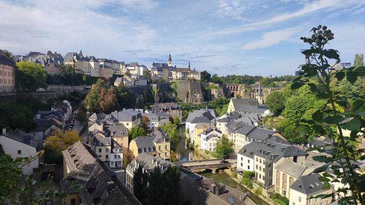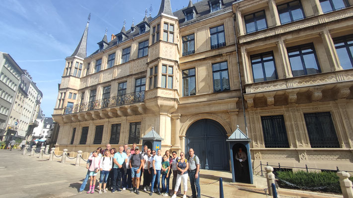 Der Samstag stand dann ganz im Zeichen der Kultur und Geschichte. Bei bestem sommerlichen Wetter brachte der Reisebus die Gruppe in das 70 km entfernte Luxemburg. Dort begab man sich am Vormittag auf einen geführten Stadtrundgang durch die Altstadt. Die drei fachkundigen Stadtführer/innen brachten den Teilnehmenden nicht nur die wechselvolle Geschichte der Stadt näher, sondern zeigten auch beeindruckende Sehenswürdigkeiten wie das Großherzogliche Palais, die Kasematten sowie die Altstadt mit ihren engen Gassen und beeindruckenden Ausblicken. Besonders beeindruckend war der Kontrast zwischen der historischen Festungsarchitektur und der modernen Infrastruktur der Hauptstadt. Bei dem anschließenden gemeinsamen Mittagessen konnten sich alle stärken, um im Anschluss die Stadt noch auf eigene Faust und nach Lust und Laune zu erkunden. Am späten Nachmittag hieß es dann Abschied nehmen und die Fahrt ging wieder Richtung Jugendherberge, wo der Tag mit dem gemeinsamen Abendessen und geselligem Beisammensein endete.