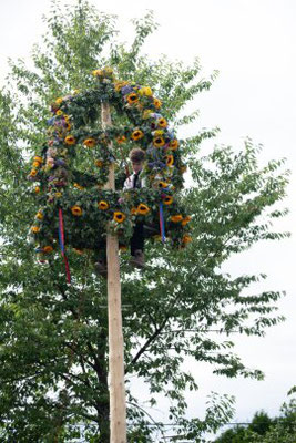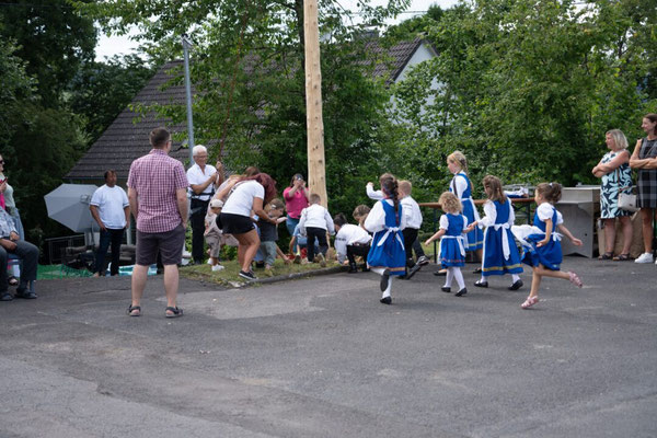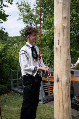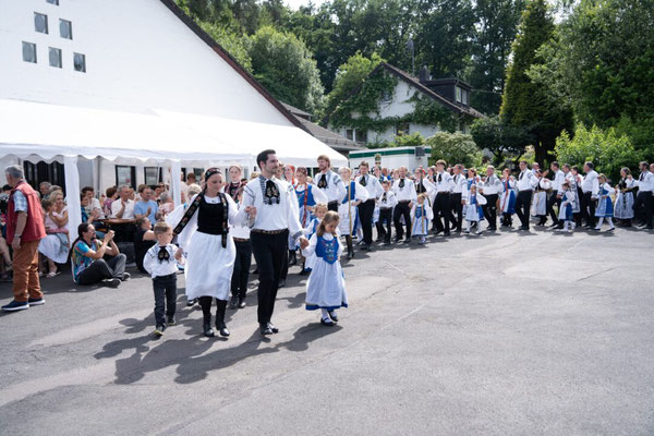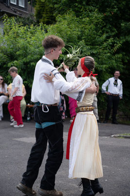 Als Höhepunkt des Nachmittages gab es zu den Klängen des Blasorchesters Siebenbürgen Drabenderhöhe den Aufmarsch der Erwachsenen- und Kindertanzgruppen Wiehl Bielstein mit anschließender Besteigung der Krone. Dennis Urbani, ebenfalls aktiver Tänzer der Jugendtanzgruppe, der diese ehrenvolle Aufgabe übernahm, richtete zuerst das Grußwort gekonnt in Siebenbürgisch Sächsischer Mundart aus luftiger Höhe an die erschienenen Gäste und belohnte dann die wartenden Kinder mit Süßigkeiten. Nach dem Abstieg, wurde traditionsgemäß ein Walzer unter der Krone getanzt bevor jede Tanzgruppe mit den verschiedenen Tänzen ihr Können unter Beweis stellte, was vom Publikum mit reichlich Applaus bedacht wurde. Der weitere Nachmittag gestaltete sich im Rahmen eines familiären Festes bei Kaffee und Kuchen sowie siebenbürgischen Grillspezialitäten. Die musikalische Unterhaltung dabei übernahm dankenswerterweise das Blasorchester Siebenbürgen Drabenderhöhe. Auch an die Kleinsten wurde mit der aufgebauten Hüpfburg gedacht, die sich trotz der warmen Temperaturen nicht vom Toben abhalten ließen. Ab 20 Uhr stellten die „Sieben Beats“ mit einem Freiluftkonzert ihr Können unter Beweis. Erst bei Einbruch der Dunkelheit begaben sich die Gäste ins Innere des Gemeindehauses, wo DJ Manu Hits von damals und heute auflegte, so dass bis in die frühen Morgenstunden ausgelassen getanzt und gefeiert wurde.
