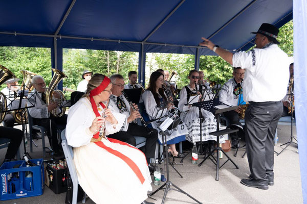 Ein besonderes Highlight war der Auftritt der Jugendtanzgruppe Wiehl-Bielstein, die mit ihrem beeindruckenden Tanz “Dreidahns” das Publikum zuerst vor der Schranne und anschließend bei strömendem Regen am Schweinemarkt begeisterte. Die jungen Tänzerinnen und Tänzer zeigten eine lebendige und mitreißende Darbietung, die die Traditionen und die Freude an der Kultur der Siebenbürger Sachsen lebendig hält. Dass die Sonne am Ende der Darbietung wieder strahlte, wird natürlich als gutes Omen gedeutet. Gekrönt wurde der Nachmittag durch den gemeinsamen Aufmarsch aller teilnehmenden Tanzgruppen unter der musikalischen Begleitung der neu gegründeten Blasmusikkapelle "Off Beat". Hier wurde das Motto mehr als nur gelebt. Auch bei den abendlichen Veranstaltungen im Festzelt wurde ausgelassen getanzt und gefeiert.